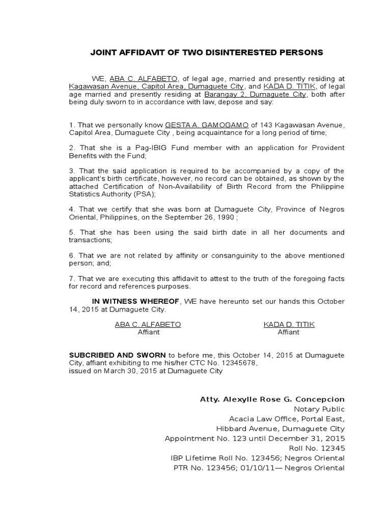 View the article and start discovering the varieties of documents that any affiant can use now! JOINT AFFIDAVIT OF TWO DISINTERESTED PERSONS We, _ and _ , both of legal age, Filipino citizens of a d d r e s s both, after being duly sworn in. I, (Insert Name of Affiant) , Filipino citizen, of legal age, single/married to (Insert Name of Spouse if any), and a resident of (Insert Address of Affiant), after.